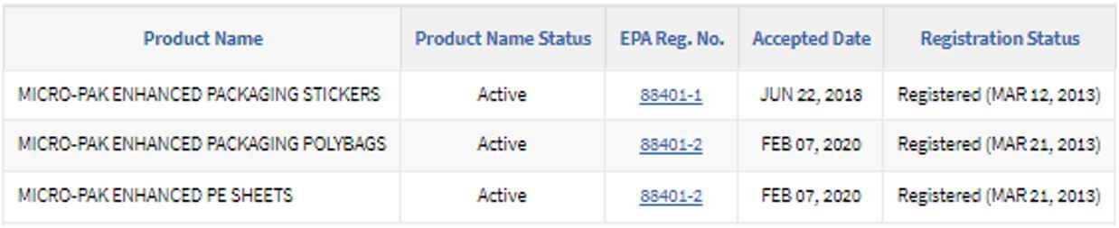 Micro-Pak’s anti-mold stickers, PE sheets, and polybags are all EPA-registered. The registration process involves rigorous safety testing at Federal level including for eye and skin irritation, inhalation and oral toxicity, as well as for efficacy (to confirm that the product functions as we say it does).
